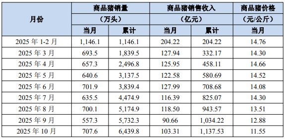 公告显示,2025年10月份,牧原股份销售商品猪707.6万头,同比变动13.17%(其中向全资子公司牧原肉食品有限公司及其子公司合计销售商品猪299.9万头);商品猪销售收入103.31亿元,同比减少22.28%。