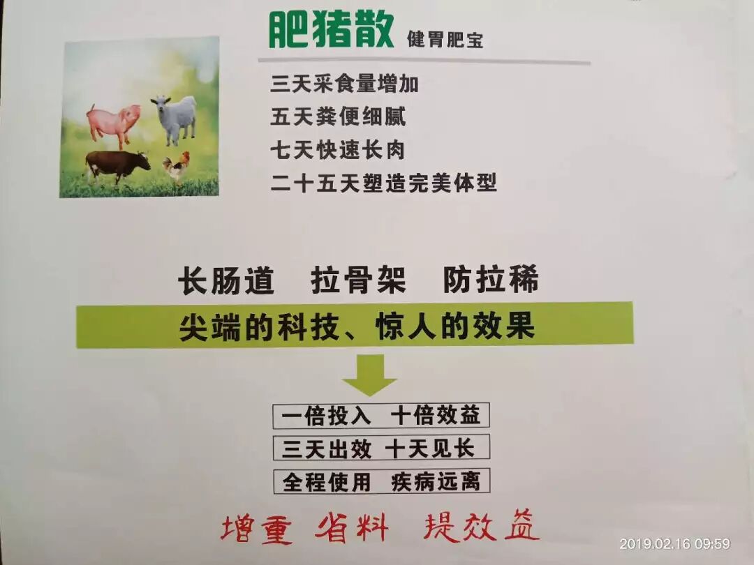 催肥促生长、助消化、预防各种异食癖,对各种原因引起的僵猪、僵羊、僵牛都有脱僵作用,拉长、拉高骨架。提高仔蓄成活率30-50%降低料肉比10%、提前出栏20天