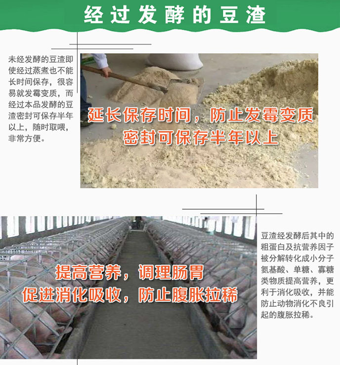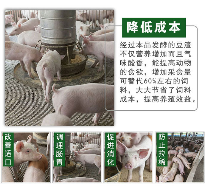 2、改善豆渣的适口性。经过发酵的豆渣,大大降解豆渣粗纤维,并且有一股酸香味,猪更爱吃食,吃的更多,长得更快。