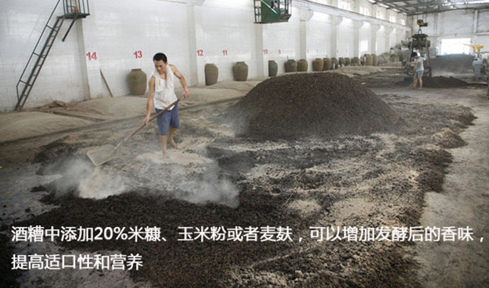 2.1公斤农富康饲料发酵剂菌液稀释到30公斤水中,与酒糟搅拌均匀,湿度控制在50%左右,偏干,加水,偏湿 加料。酒糟尽量用新鲜的,如果不新鲜的酒糟,可以晒干后粉碎,成了酒糟粉,再进行发酵。