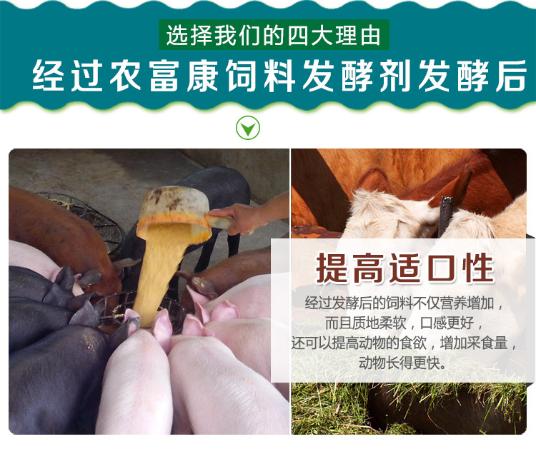 我们以使用菜籽饼饲料养猪为例,为了节约养殖成本,越来越多的养殖户选择寻找更合适喂猪的精饲料替代料,豆渣饲料菜籽饼饲料酒糟饲料饼粕豆粕菌渣饲料等都是喂猪饲料的首选,而使用益生菌微生物发酵这些粗饲料成为优质精饲料替代料养猪节约养殖成本的有效方法。农富康饲料发酵剂属于微生物制剂,对猪完全的没有伤害,在有益菌发酵粗饲料过程中分泌与合成大量活菌、蛋白质、氨基酸、各种生化酶、促生长因子等营养与激素类物质,可有效改善各类粗饲料适口性,降低养猪成本,提高饲料营养。使用农富康饲料剂发酵后的菜籽饼饲料喂猪还能提高饲料转化率,对猪产生免疫、营养、生长刺激等多种作用,达到防病治病、提高成活率、促进生长和繁殖、降低成本、消除粪尿臭味、净化环境、增产增收等效果。